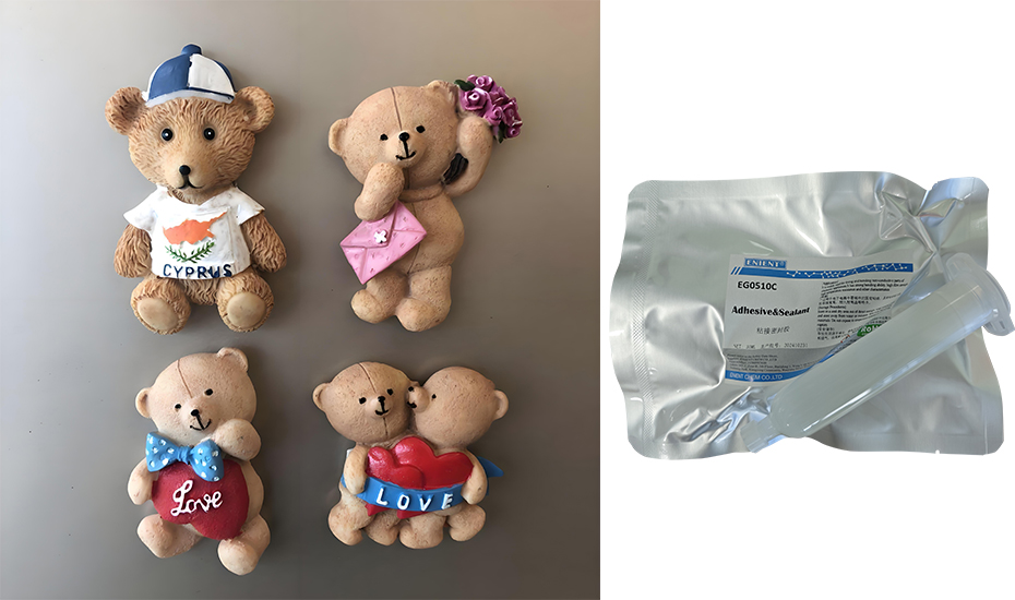 某出口冰箱贴厂商选择这款胶水替代传统的环氧树脂胶,解决了磁铁脱落和胶水老化的问题。经过一年多的出口销售,无一客户反馈粘接质量问题,帮助企业成功打开了北美和欧洲市场。