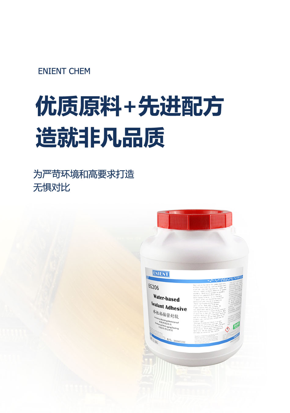 对于喇叭这种经常在露天场合使用的产品,防水是其不可缺少的功能。ENIENT EG206是用水做溶剂的水性胶水,固化后不溶于水,有绝佳的防水性能,能对喇叭音膜起到更好的保护作用。ENIENT EG206在制作时采用了特殊的水基型配方,这使它拥有优异的防水性能和绝缘性能,并且十分安全环保,不会对环境和人体造成损伤,这对于与人体长时间接触的物品来说是很重要的一点。